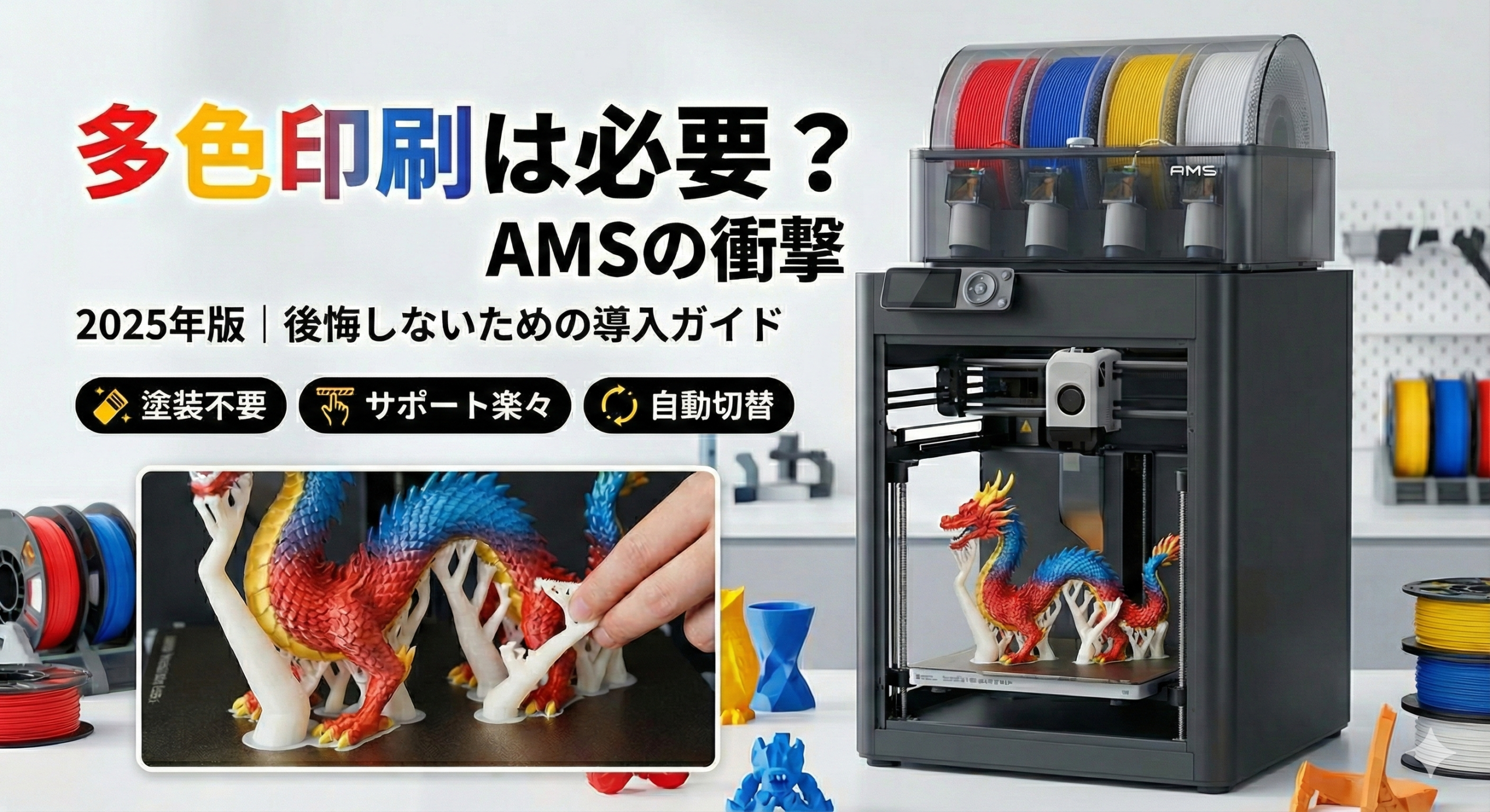 しかし、Bambu LabのAMS(自動素材供給システム)の登場で、その常識は完全に塗り替えられました。ボタン一つで、プラモデルのように色分けされた造形物が完成する時代です。