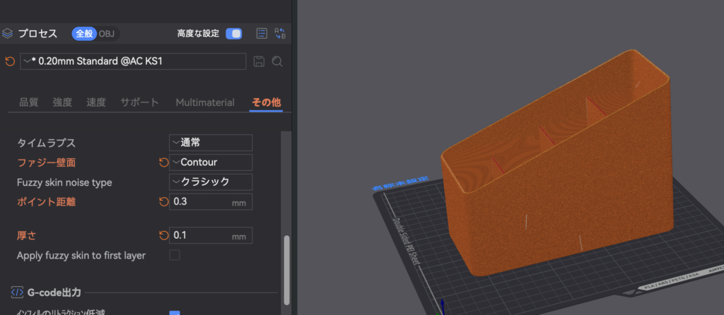 スライサーに標準搭載されている ファジー面(Fuzzy Skin) 機能。
